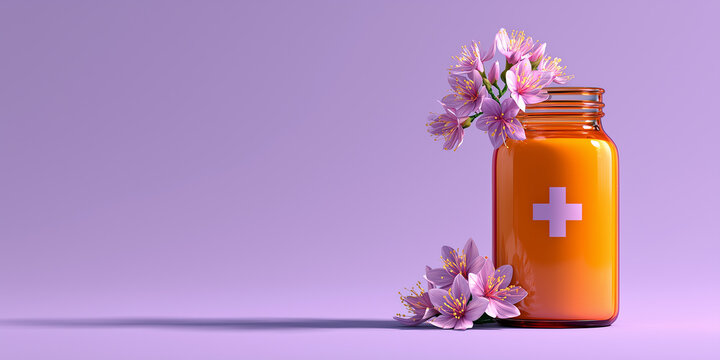 Orange pill bottle with natural lavender flowers on purple background, symbolizing women's health, self care, and wellness copy space banner