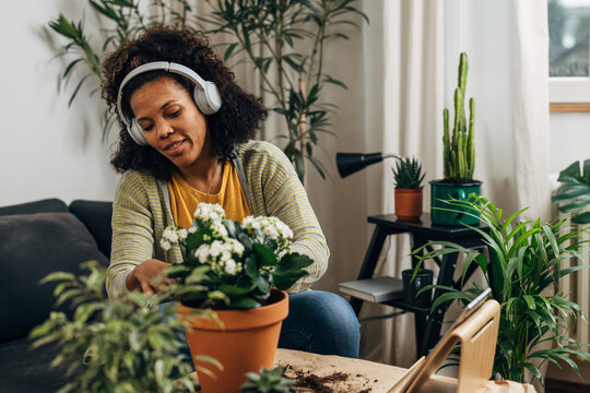 A woman plants flower-plant at home