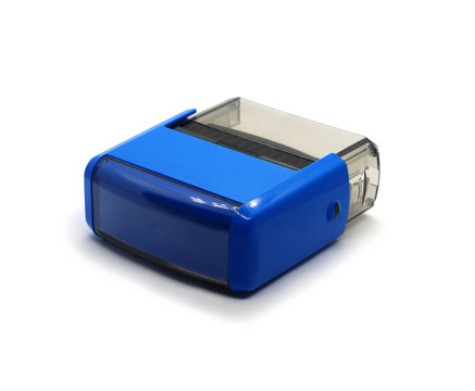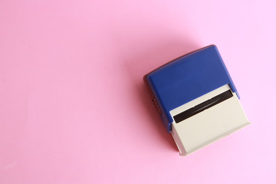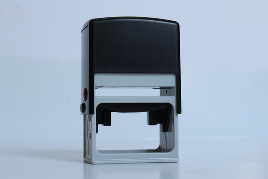 A male hand holding a self-inking, rubber company logo stamp. A paperwork. Office accessories.