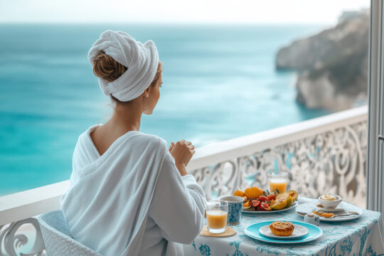 Relaxing bubble bath scene mid-adult woman with towel-wrapped hair and black railing