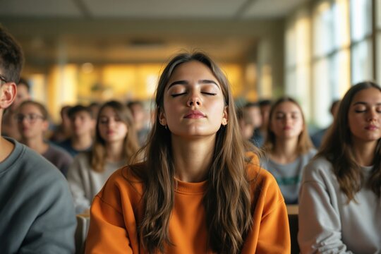 Woman meditating in sunroom practicing mindfulness and yoga mudra in casual activewear