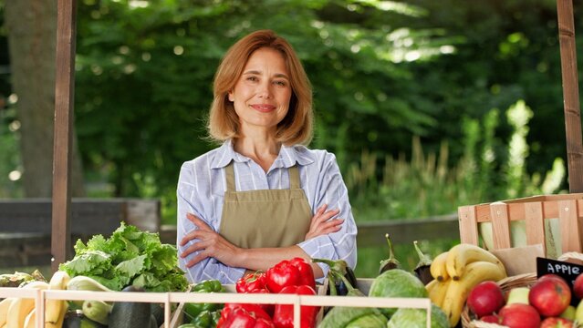 Smiling grocery staff weighing tomatoes at supermarket counter