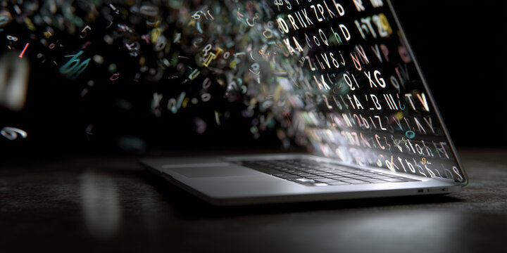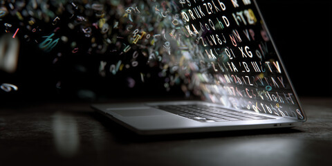 Floating glyphs above laptop show AI semantic translation in real time.