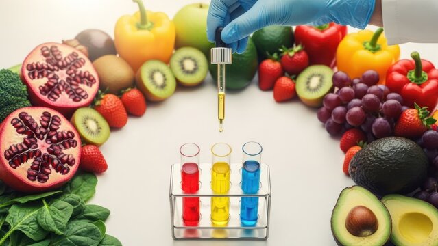 Scientist dropping liquid into tubes next to fresh produce, arranged in a colorful semi-circle