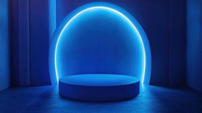 Abstract realistic 3d blue cylinder pedestal podium with a dark blue abstract room with semi circle glowing neon lighting scene. Rendering product display presentation. Round podium background