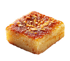 A plate of sweet semolina cake (Basbousa), isolated on white background