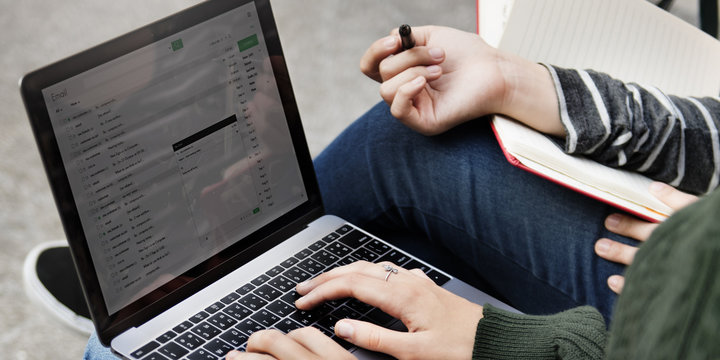Close up Woman hand using Laptop with email icon.Work from home,Digital newsletter and Email marketing concept