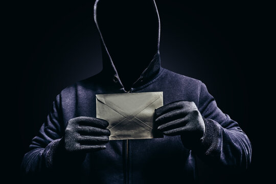 Photo of scary shaded hooded man holding paper letter on dark background.