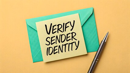 Verify sender identity note on envelope with pen on yellow background