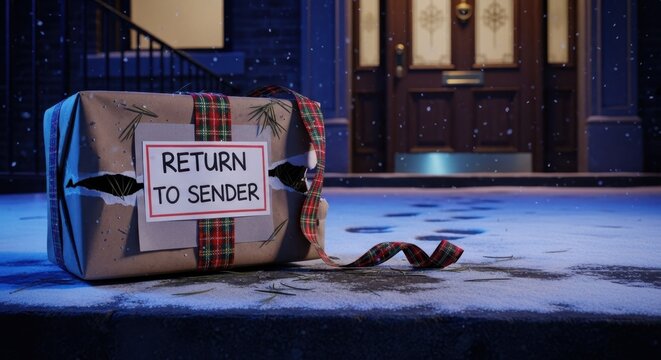 Return to sender message on wrapped gift near door with tartan ribbon in night scene. Return to sender holiday gift has paper label with message on kraft wrapping near festive New Year door.
