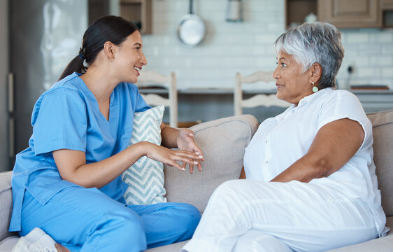 Elderly woman smiling while receiving medication advice from caregiver in cozy home