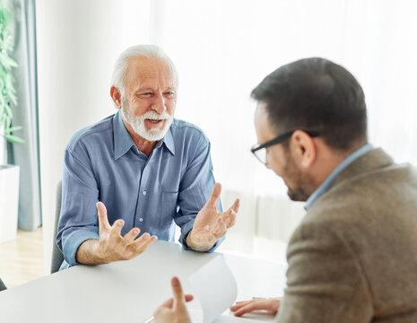 Senior man engaged in expressive conversation indoors