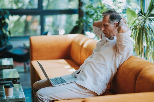 A black senior man in casual clothes is focusing on a laptop screen, concentrating and thinking seriously.