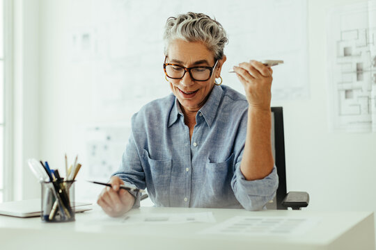 Female architect analyzing building plans in modern office
