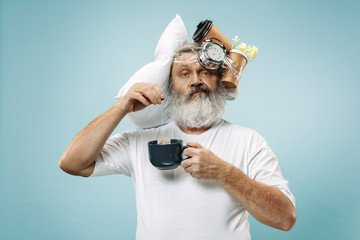 Surprised senior man drinking tea after sleeping at home or office having too much work. Bored businessman with pillow and hourglass. The busy, boring, worried, be late, concerned, sleep day