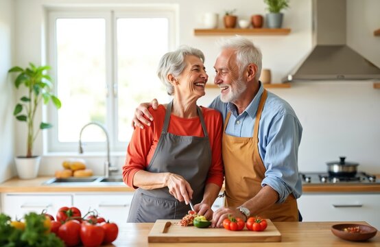 Elderly couple in kitchen prepare meal together. Happy senior man, woman cooking at home. Cheerful husband, wife cut vegetables, looking each other, smiling. Togetherness, love, retirement life.