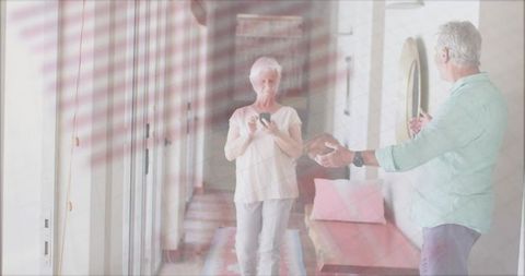 Senior couple communicating in cozy living room setting