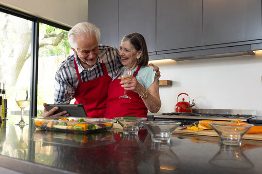 Senior couple cooking together in kitchen, enjoying wine and using tablet, at home