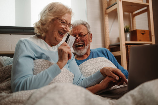 Portrait photo of laughing elderly couple shopping online by using credit card and laptop while lying in bed. They both wearing glasses.