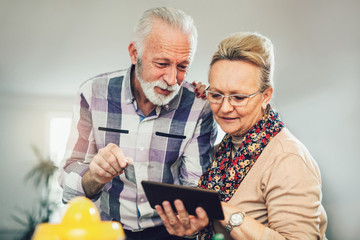 Happy older mature family couple having breakfast using digital tablet in kitchen. Smiling mid age senior husband and wife looking at pad computer enjoying morning meal together shopping online.