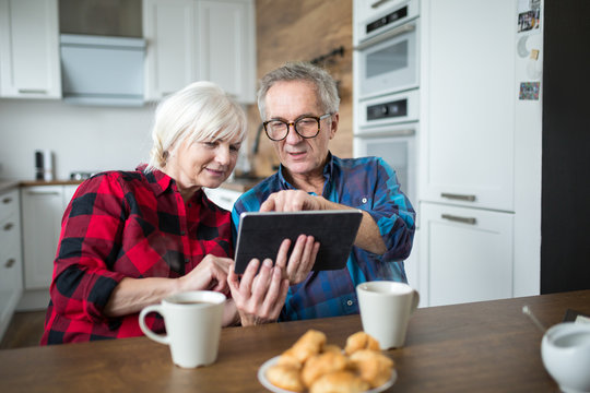 Senior Couple Smiling While Using Tablet In Kitchen Images