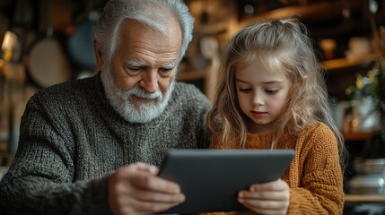A scene of a grandfather and granddaughter engaging with digital technology, using a tablet in a kitchen setting.
