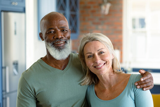 Portrait of happy senior diverse couple in kitchen embracing and smiling