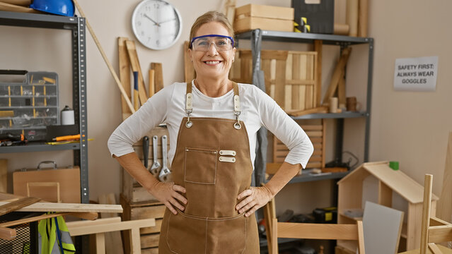 Smiling woman in apron posing in a cluttered carpentry workshop, indicating craftsmanship and professionalism