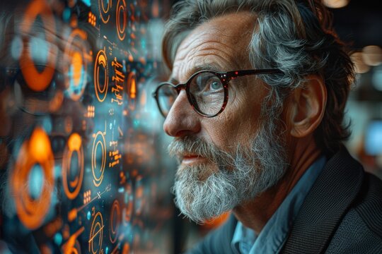 Senior Caucasian man with glasses examines digital data on a futuristic interface. He has gray hair and a beard, showcasing advanced technology concepts.