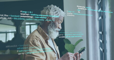 Image of data processing over senior african american businessman using smartphone