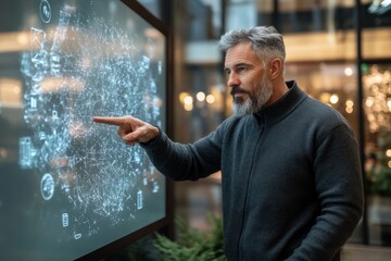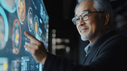 A mature man interacts with a digital interface displaying technology icons and data, suggesting advanced analytical skills and innovation.