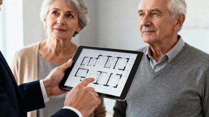real estate agent senior clients concept. Couple discussing plans with a professional using a tablet.