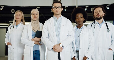 Portrait of Caucasian and African American young and senior doctors in medical coats standing in lab in hospital looking at camera. Healthcare workers team in clinic. Medicine concept