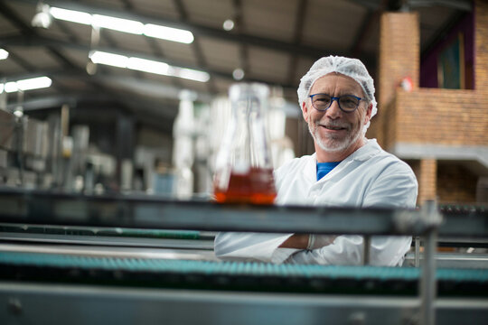 Senior man wearing lab coat inspecting Erlenmeyer flask on conveyor belt in plant, copy space
