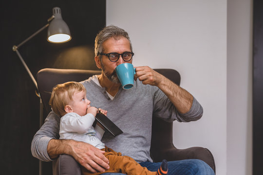 Senior Man Drinking Coffee While Using Tablet At Home Images