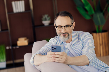 Confident businessman in casual attire enjoys leisure time while using a smartphone indoors in a modern home environment