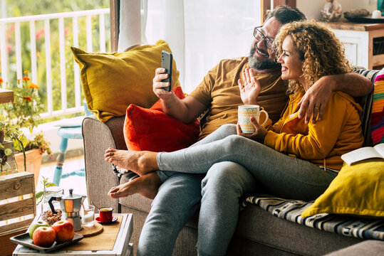 Adult happy couple man and woman at home enjoy morning breakfast and do video phone call to friends or parents - cheerful caucasian people indoor activity in love and real life