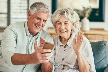 Video call, hello and smile with old couple and phone on sofa for streaming, social media and communication. Network, internet and wave with senior man and woman in living room at home for mobile app