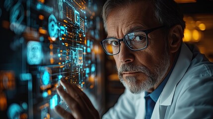 A senior doctor intently studies complex medical data displayed on a futuristic interface, showcasing advancements in healthcare technology.