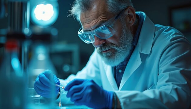 Experienced scientist wears protective gear, works with samples in bright lab. Focused researcher examines test tube, advancing science, medical discovery with detailed analysis. Pro in research.