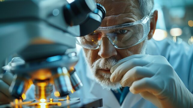 A senior scientist meticulously examines samples under a microscope in a modern laboratory setting.