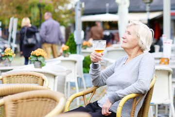 Happy senior woman drinking beer outdoors in the cafe