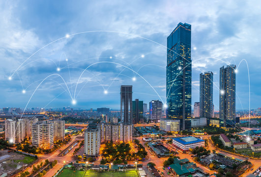 Smart city and wireless communication network concept. Digital network connection lines of Hanoi city
