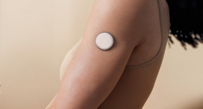 Closeup of adult white woman with glucose monitoring patch on upper arm, shallow depth of field