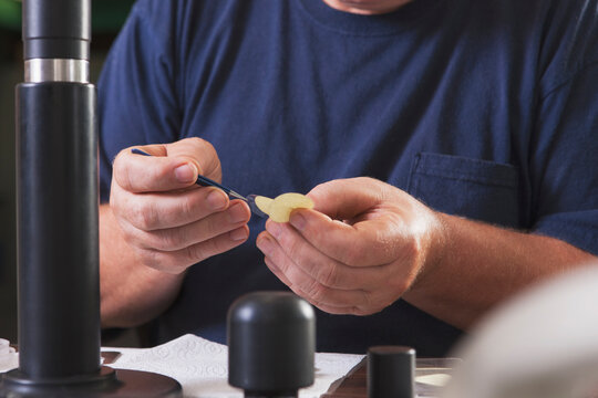 Close up of examining a sample of microchip transistor with probe station under the microscope in laboratory.A semiconductor on a silicon wafer. Selective focus.