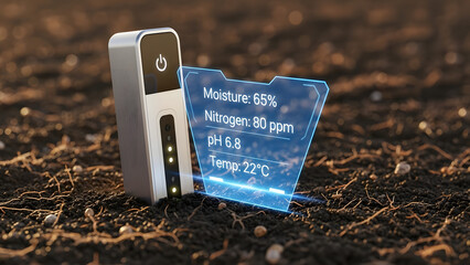 Soil analyzer device showing moisture nitrogen pH and temperature readings in field