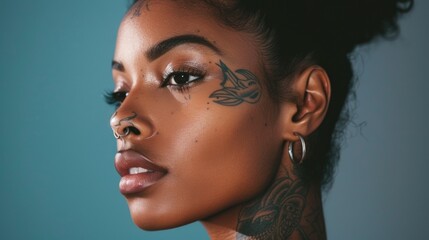 Close-up of a captivating face featuring a septum piercing and bold lipstick, exuding confidence and beauty.