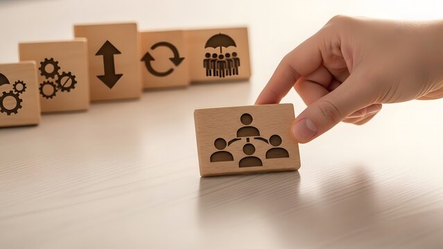 Hand placing organizational chart block into a sequence of business process blocks