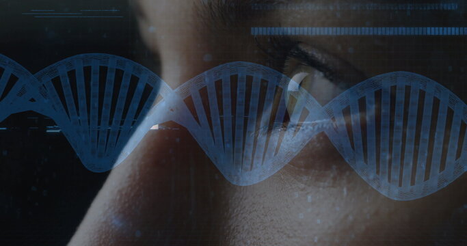 Glowing blue dna double helix with hud and binary overlay for biotech visualization