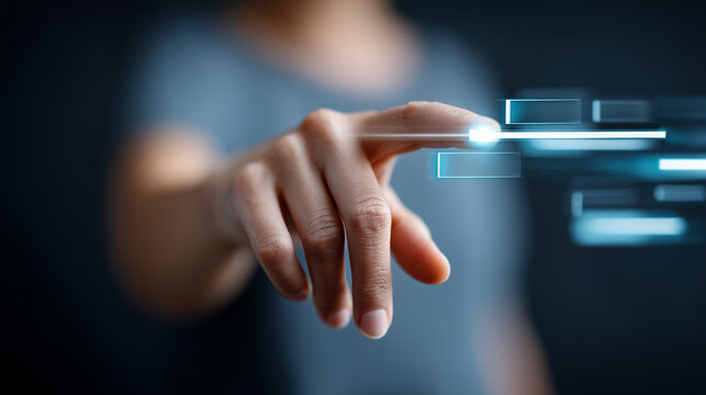 Faceless finger selecting glowing step on futuristic digital timeline, heavily defocused interface background, anonymous person symbolizing workflow and progress, sequential task v